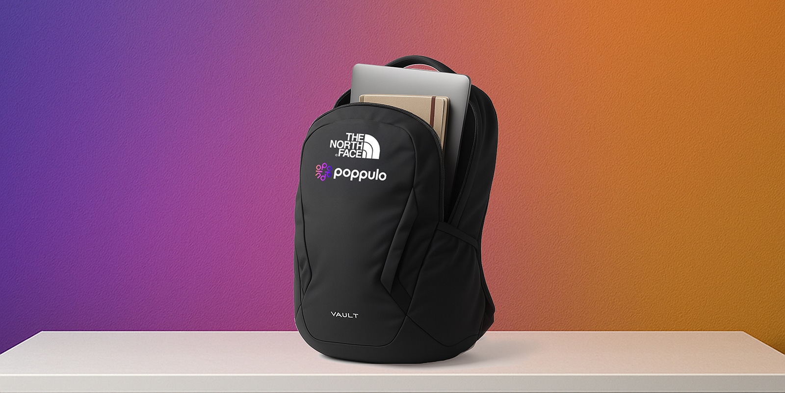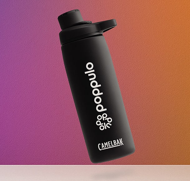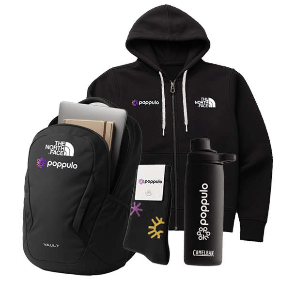 The merchandise selection included a North Face full-zip hoodie embroidered with the Poppulo logo, a Camelbak Chute insulated bottle with vertically aligned branding, and a North Face Vault laptop backpack, ideal for employees on the go.